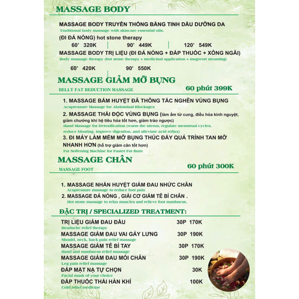 Massage Body Trị Liệu ( Đá nóng + Đắp thuốc + xông ngãi)